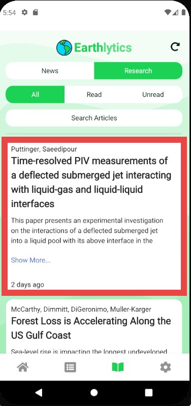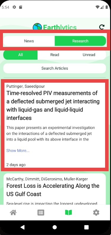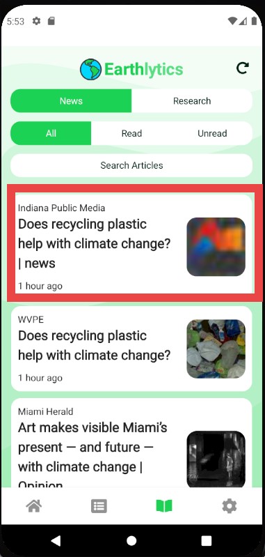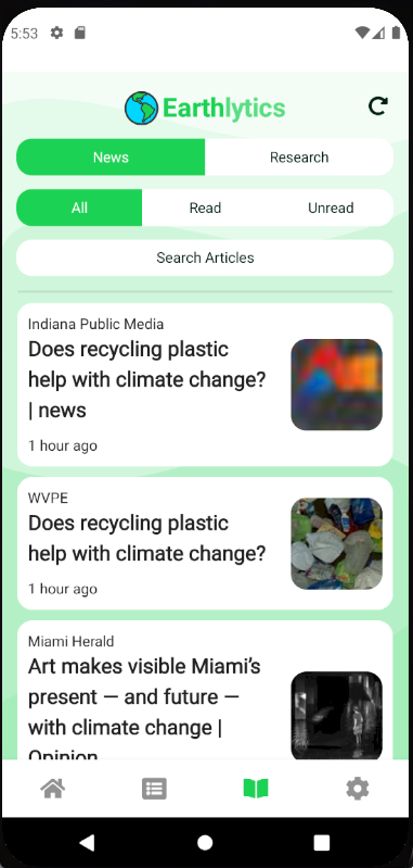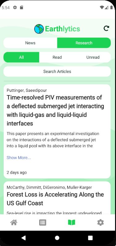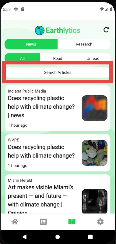 Upon navigating to the Publications page in the Earthlytics bottom navigation bar, you will land on the News page. The News page allows searching and will save any Read and Unread articles for easy access.