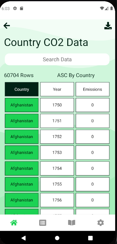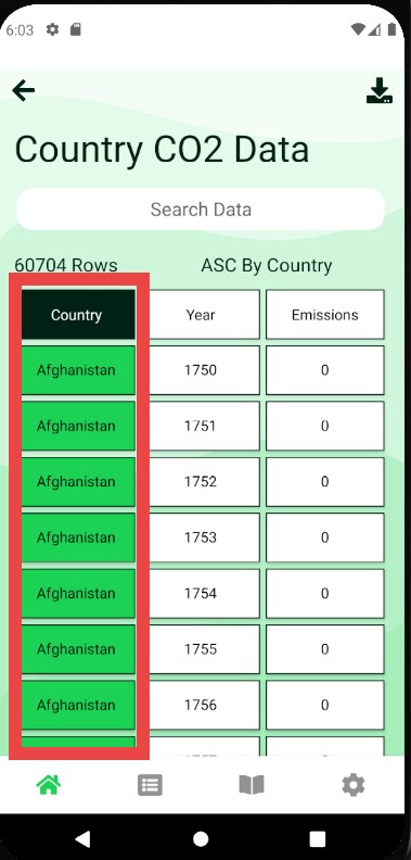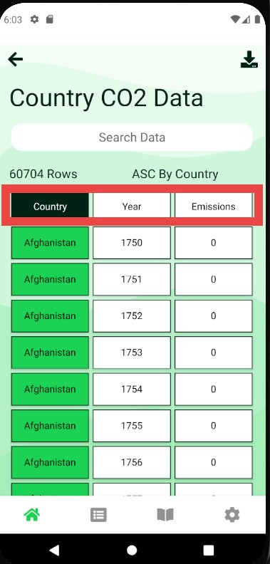 Sorting in Earthlytics tables requires the use to click on column headers, clearly displayed at the top of a given table. Designated sorting column headers will appear green and the current order of the sort will appear above the table, to the right side of the screen.